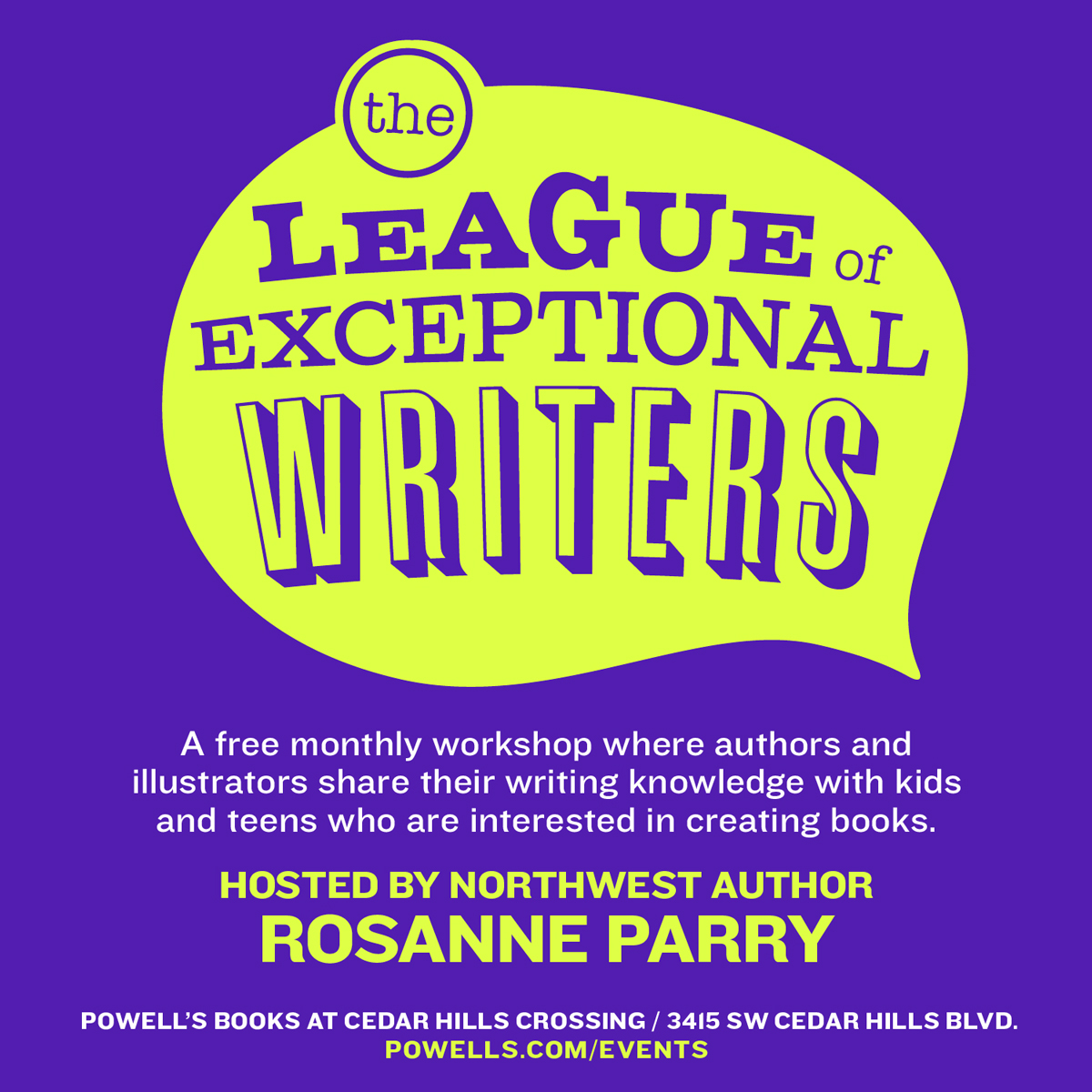 - The League of Exceptional Writers this Saturday at Powell’s Cedar Hills, November 12, at 2:00PM (Ages 8-18). Click here for more.